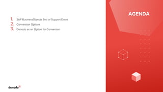 The document outlines the transition plan for SAP BusinessObjects (BO) customers as mainstream maintenance for version 4.3 ends in 2025, emphasizing options to migrate to SAP Analytics Cloud or SAP BusinessObjects Private Cloud Edition by 2027. It introduces a product deep-dive series by Denodo, which serves as a strategic guide for customers looking to leverage Denodo's data virtualization in conjunction with their BI reporting needs. Furthermore, it discusses various approaches for migrating reporting views and business logic from SAP BO to Denodo's platform, highlighting development resources and timelines involved in such projects.