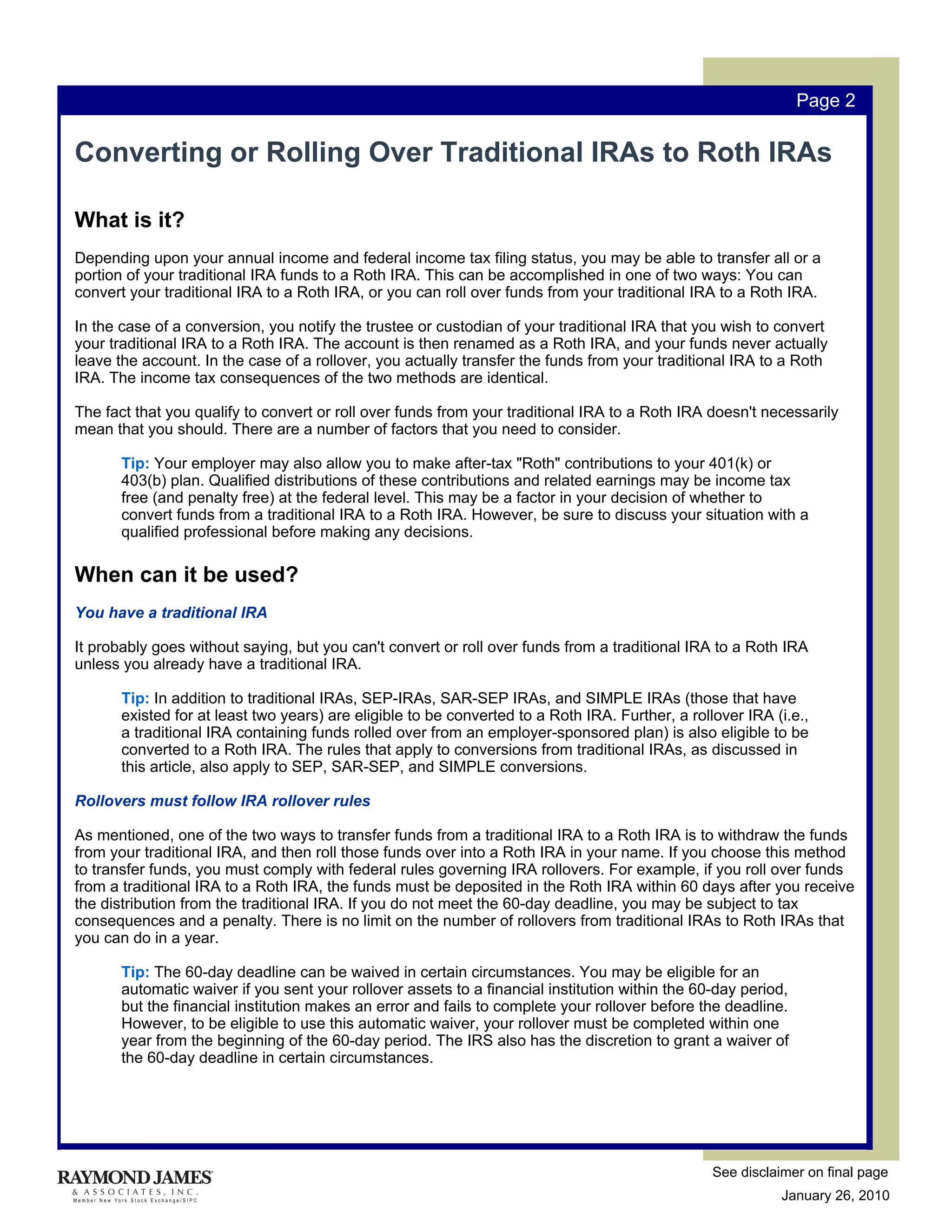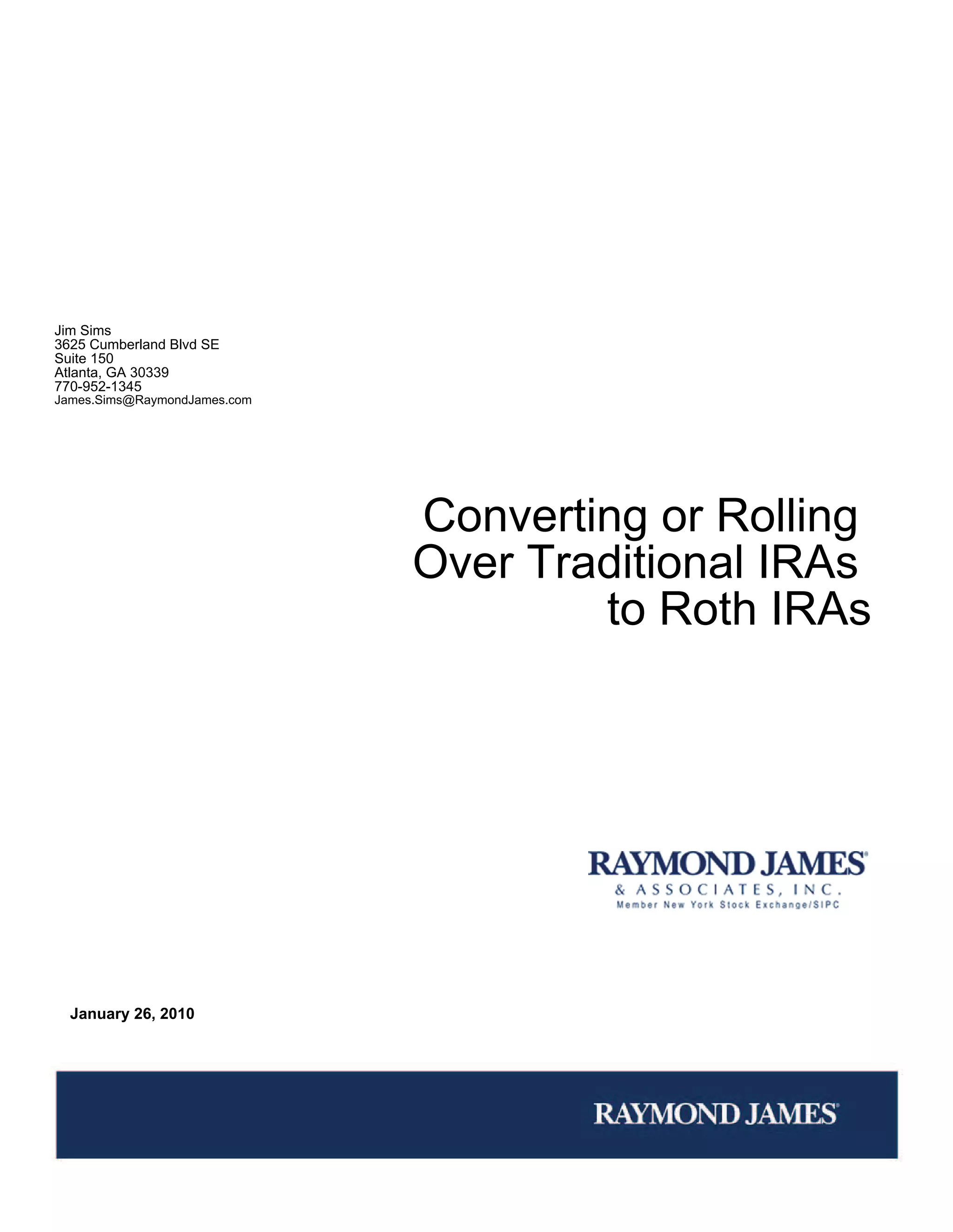 Jim Sims provides information on converting or rolling over traditional IRAs to Roth IRAs. There are two ways to transfer funds: conversion or rollover. With conversion, funds stay in the account but it is renamed as a Roth IRA. With rollover, funds are transferred from traditional to Roth IRA. Qualified distributions from Roth IRAs are tax and penalty free. However, converting traditional IRA funds to Roth IRA requires paying taxes now on amounts converted.