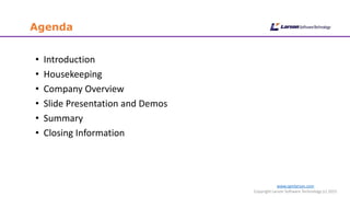 The document details a webinar hosted by Larson Software Technology and VizualSite LLC about transforming technical graphics, covering various topics such as data sources, graphic formats, and the importance of using best practices in graphic conversion. Key points include the challenges of reusing graphics from different formats, techniques for optimizing raster and vector data, and the software tools available for graphic creation and editing. Attendees participate in interactive polls to share their experiences with different file formats and CAD systems.