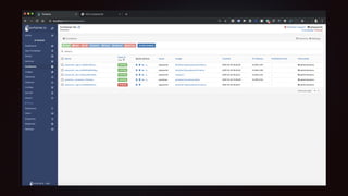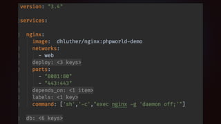 The document outlines the conversion of a development environment to a Docker stack, highlighting configurations for services such as PHP, Nginx, and MySQL using Docker Compose. It includes examples of Docker command syntax, common actions, and deployment practices, emphasizing the differences between containers, services, and stacks. Additionally, it discusses the use of volumes for storage and addresses potential issues with setting up Docker environments.
