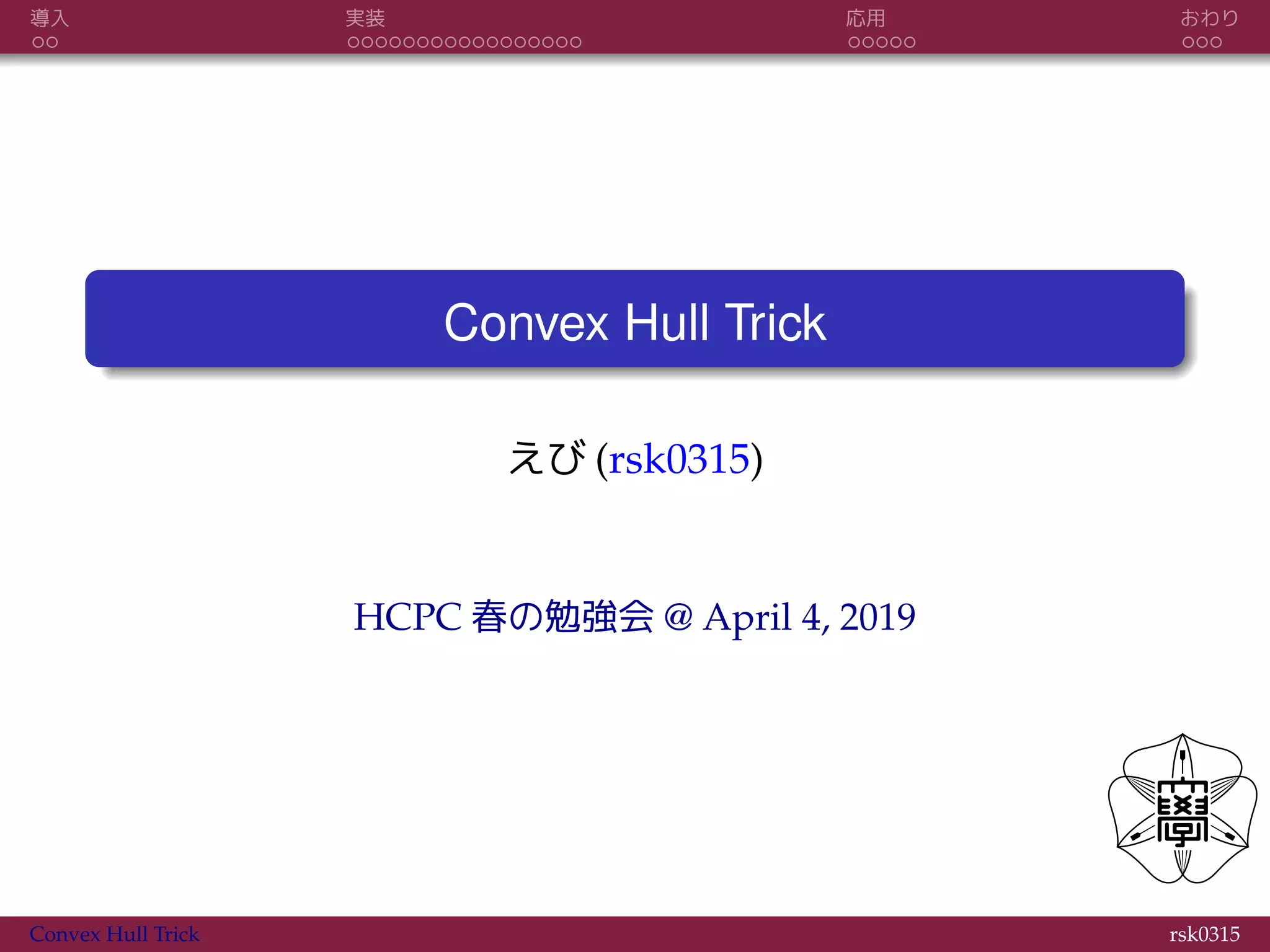 おわり Convex Hull Trick えび (rsk0315) HCPC 春の勉強会 @ April 4, 2019 Convex Hull Trick rsk0315