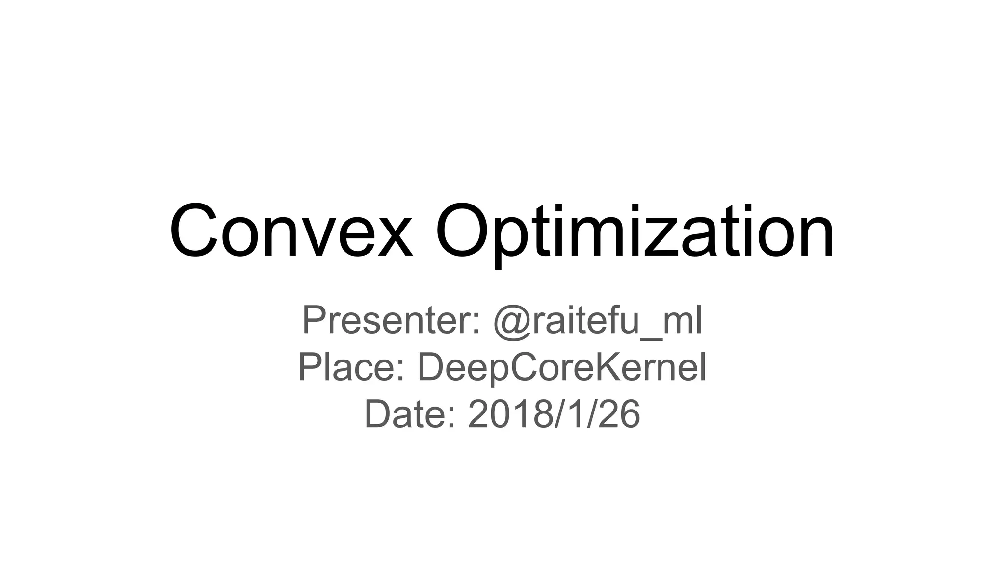 Convex optimization(https://web.stanford.edu/~boyd/cvxbook/bv_cvxbook.pdf)の1~4章の内容を紹介した. 主に扱ったトピックは凸集合, 凸関数, 凸最適化の定義や例で内容は初心者向け. 気になった人は是非原著に当たって欲しい.