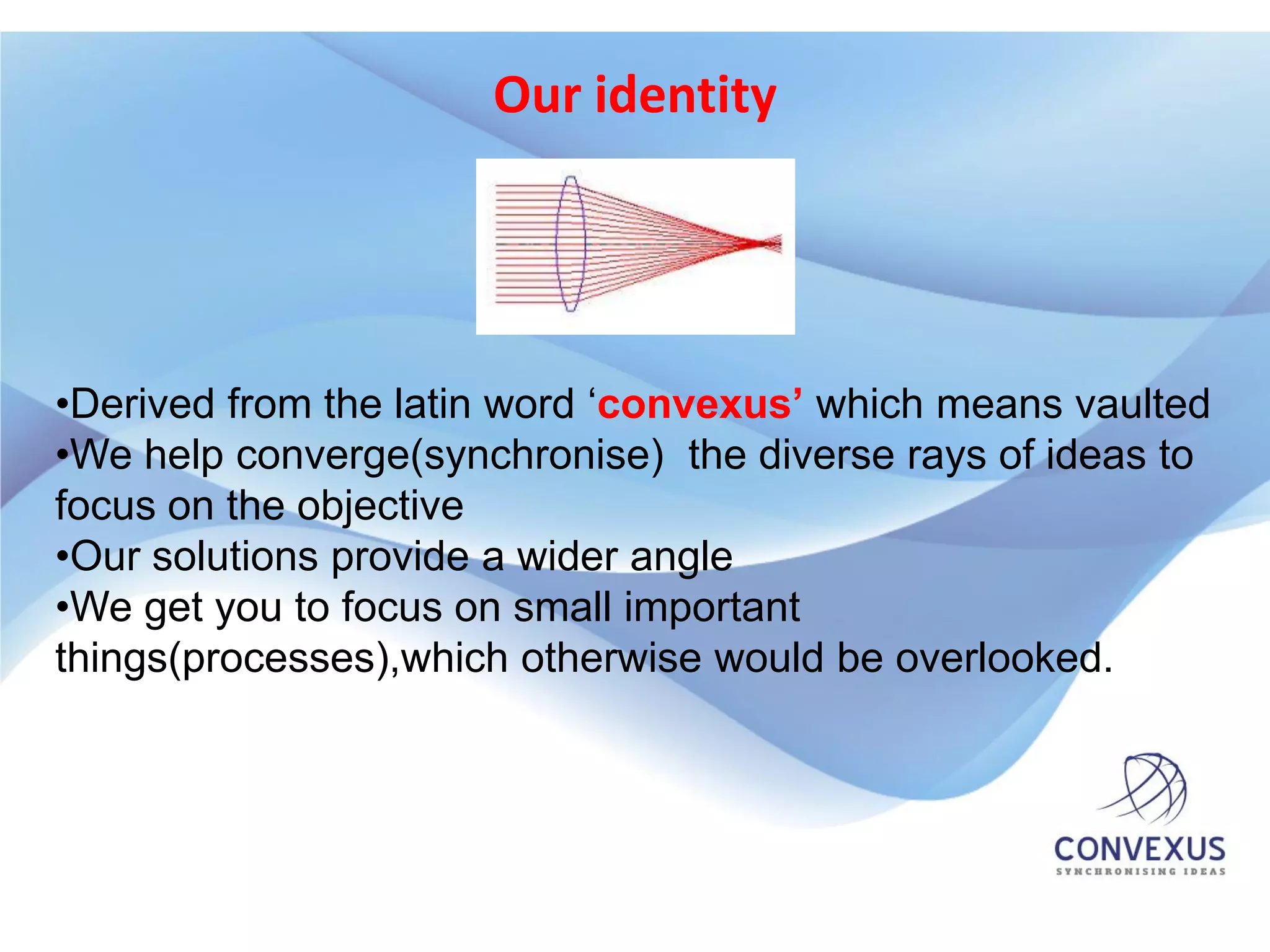 Convexus is a niche consulting firm that provides expertise in developing customer acquisition, management, and retention processes. It was founded by three entrepreneurs with over 50 combined years of experience in sales, marketing, and operations at companies like Castrol and Asian Paints. Convexus focuses on understanding client needs, constraints, and environments to provide unique solutions that improve process efficiencies. Its services include consulting, learning solutions, and technology tools to enhance productivity and monitoring in areas like customer management, sales processes, channel strategies, and product communication development.