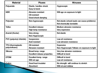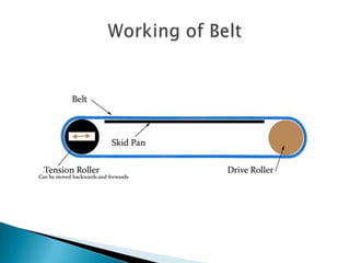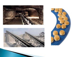 Conveyor belts are used widely in industry to transport materials. They consist of an under layer called the carcass for strength and an over layer called the cover. Belts are made of materials like rubber, plastic, or cotton. The type of belt used depends on the size, weight, and shape of items being moved. Benefits of belt conveyors include their ability to handle high capacities over long distances economically. They are suitable for abrasive, wet, dry, or dirty materials. However, belts may require higher tension and are susceptible to issues with sticky materials.