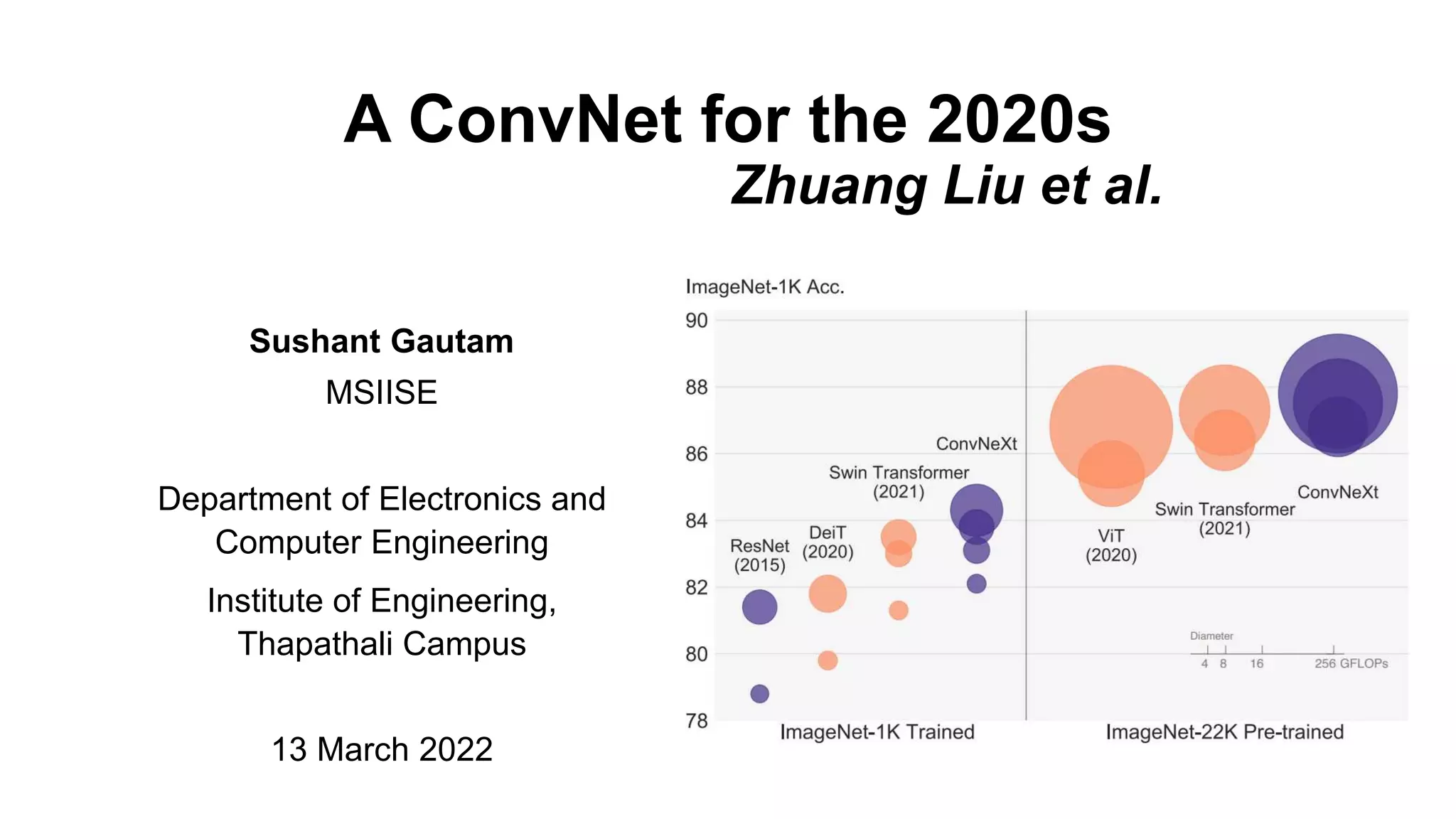 The document presents ConvNeXt, a pure convolutional neural network architecture that achieves performance on par with state-of-the-art vision transformers. The authors modernized ResNet architectures with techniques from vision transformers like increased training epochs, data augmentation, and larger kernel sizes. This resulted in ConvNeXt surpassing Swin transformers on various tasks like image classification, object detection, and segmentation while retaining the simplicity and efficiency of convolutional networks. The study challenges beliefs that vision transformers are inherently more accurate and efficient than convolutional networks.