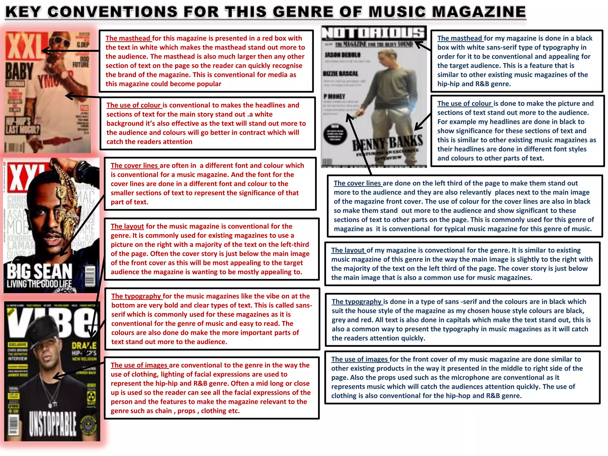 The layout, typography, use of images and color in the sample music magazine are conventional for the genre. The headline is prominently displayed in a large sans-serif font above the article. The image is placed on one side of the spread with the text on the other. The colors used match the magazine's house style. This layout and design elements are similar to other existing music magazines and help make the content appealing to the target audience.