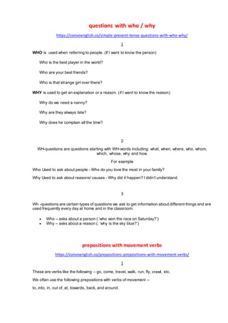 Who and why questions are commonly used in the simple present tense to ask about people and reasons. Who is used to refer to people, as in "Who is your best friend?" Why is used to ask for an explanation or reason, like "Why are they late?" WH-questions start with words like what, when, where, who, why and how to solicit different types of information. Prepositions like to, into, in, out of, at, towards, back and around are often used with verbs of movement to indicate direction or destination of movement. Negative statements are formed by using the word "not" after a helping verb like "is" or "are" to negate the sentence, such as