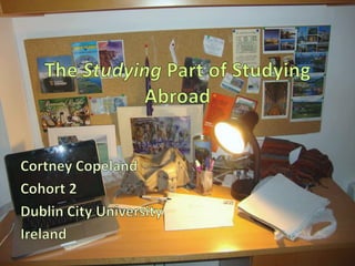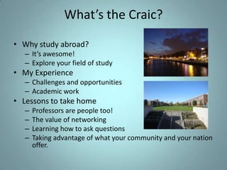 The document discusses the benefits of studying abroad including exploring other fields of study, places, cultures, and perspectives. It describes the author's experience studying in Dublin, Ireland, mentioning challenges like cultural differences in academia but also opportunities to explore and engage with the local environment. Key lessons discussed are that professors are also people, the importance of networking, learning how to ask questions, and taking advantage of opportunities in one's community both abroad and at home.