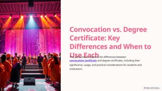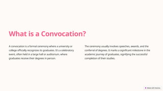 The document outlines the differences between convocation ceremonies and degree certificates, highlighting their significance and usage. A convocation is a celebratory event recognizing graduates, while a degree certificate serves as official proof of academic achievement. Understanding these distinctions is essential for maintaining academic integrity and professionalism, as well as for clarity in applications for jobs and further studies.