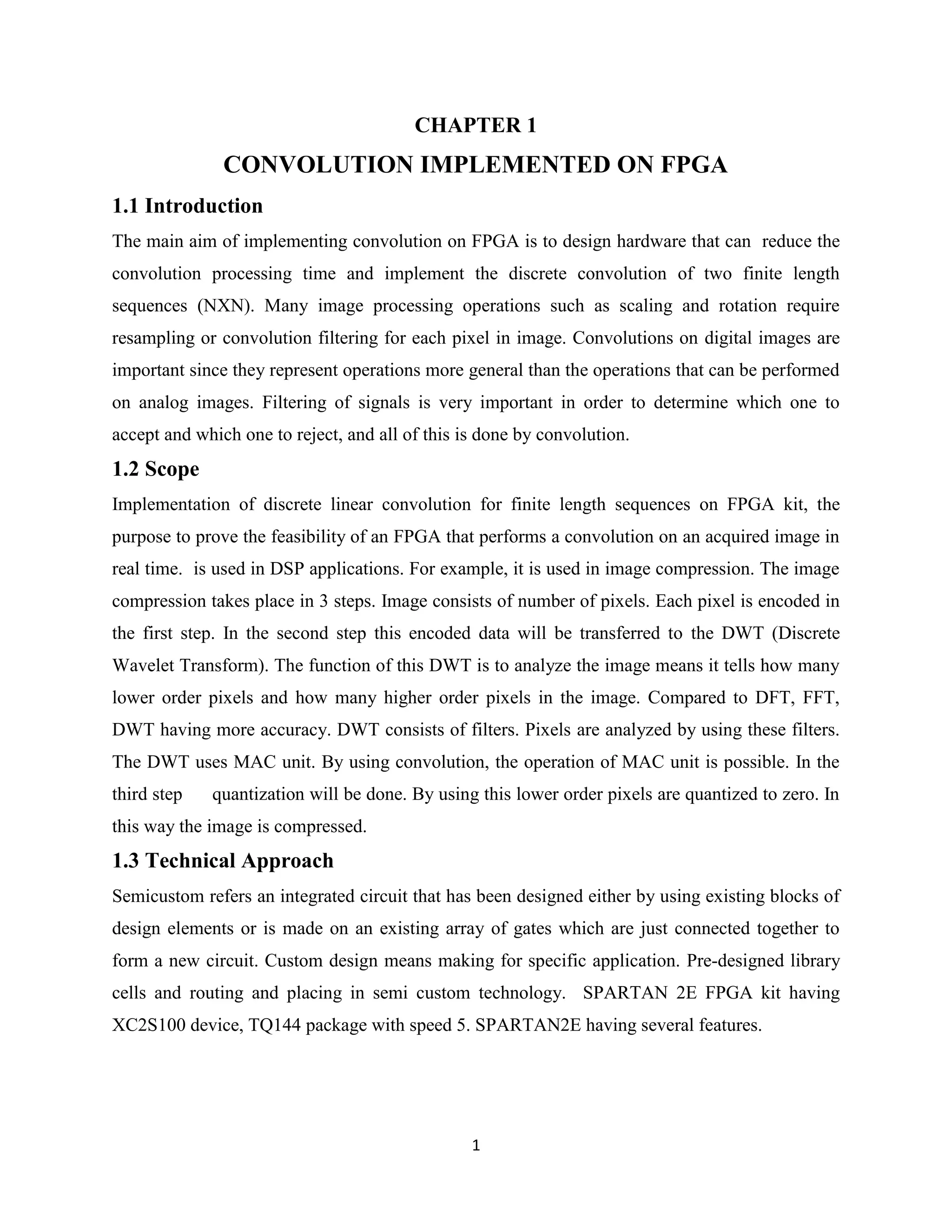 The document discusses implementing convolution on an FPGA. It begins by introducing convolution and its applications in image processing. It then discusses the scope and technical approach of implementing discrete linear convolution on FPGA kits in order to perform convolution on images in real-time. The document outlines the structure of FPGAs, including configurable logic blocks and wiring tracks. It also discusses software requirements and provides an organization plan for subsequent chapters on linear convolution, FPGA technology, and a literature survey.