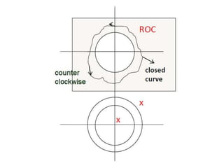 This document discusses two methods for inverse z-transforms: the convolution method and the residue method. The residue method can be used when the function is rational in the form of p/q, with unique finite poles. It involves contour integration around the origin, inside the region of convergence. The poles are the roots of the denominator polynomial. The convolution method uses the property that the inverse z-transform of two signals multiplied in the z-domain is the convolution of their inverse z-transforms.