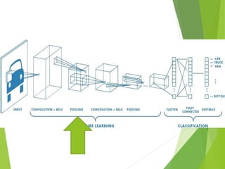 Convolutional neural networks (CNNs) are a type of neural network designed to process images. CNNs use a series of convolution and pooling layers to extract features from images. Convolution multiplies the image with filters to produce feature maps, while pooling reduces the size of the representation to reduce computation. This process allows the network to learn increasingly complex features from the input image and classify it. CNNs have applications in areas like facial recognition, document analysis, and image classification.