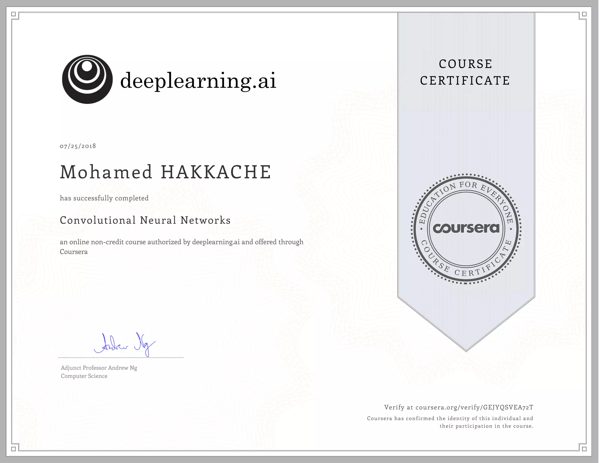 This document is a course completion certificate for Mohamed HAKKACHE who successfully completed an online non-credit course on Convolutional Neural Networks through Coursera. The certificate confirms Mohamed's identity and participation in the course, which was authorized by deeplearning.ai and offered through Coursera, with Adjunct Professor Andrew Ng of the Computer Science department.