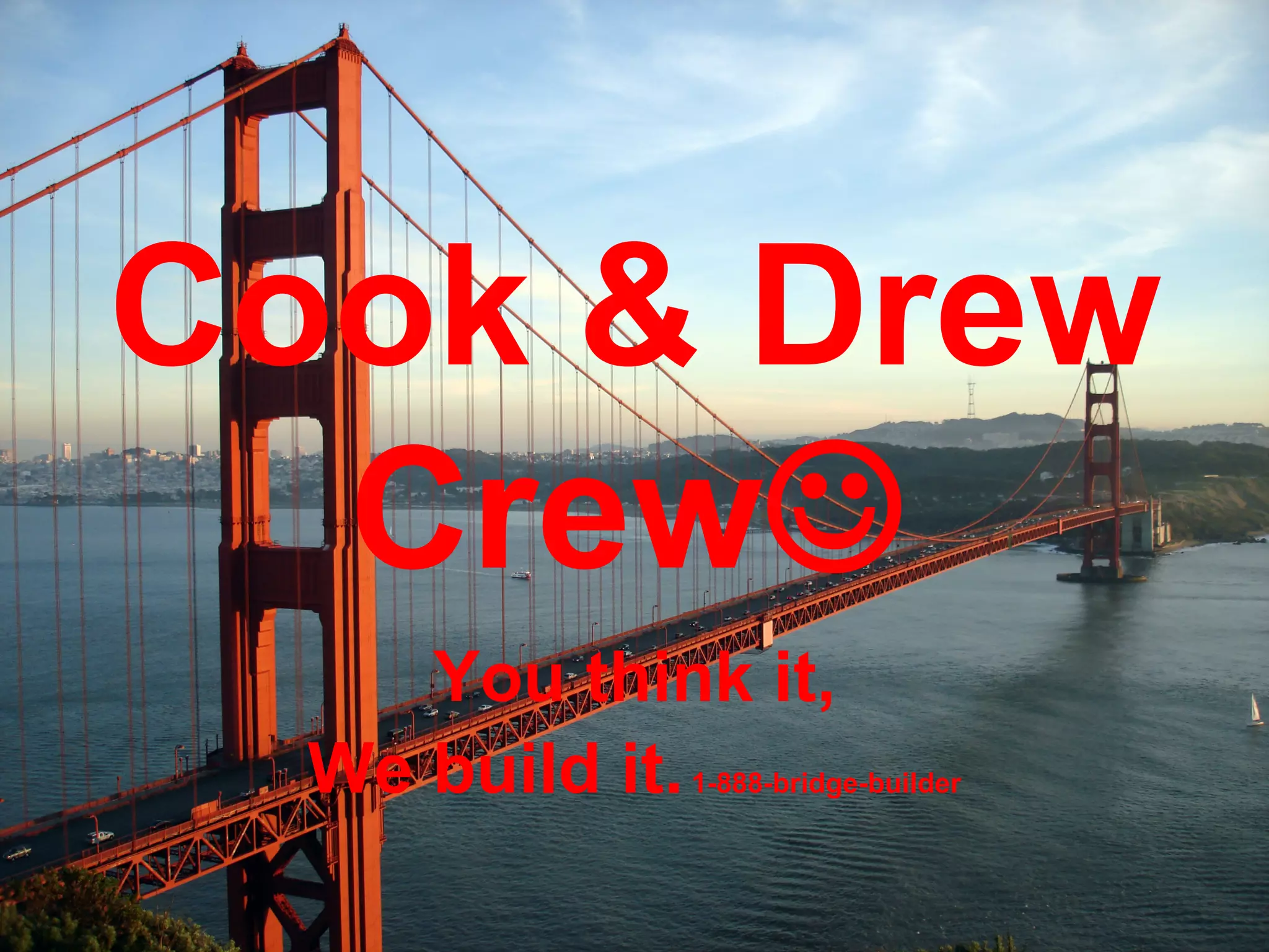 The document promotes a bridge building company called Cook & Drew Crew that designs and builds bridges according to customer specifications. It provides a phone number and images showing a Google Earth picture of a location, a SketchUp model of a bridge, and a picture of a completed bridge made of popsicles to demonstrate the types of bridges that can be built.