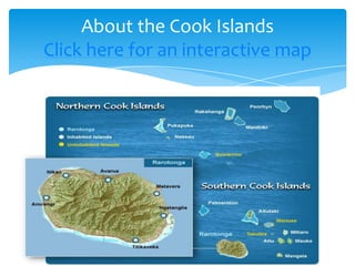The document provides information about electives offered at Onehunga Primary School in the Cook Islands for 2012, including links to learn more about the culture, language, and traditional arts like dance and drumming of the Cook Islands.