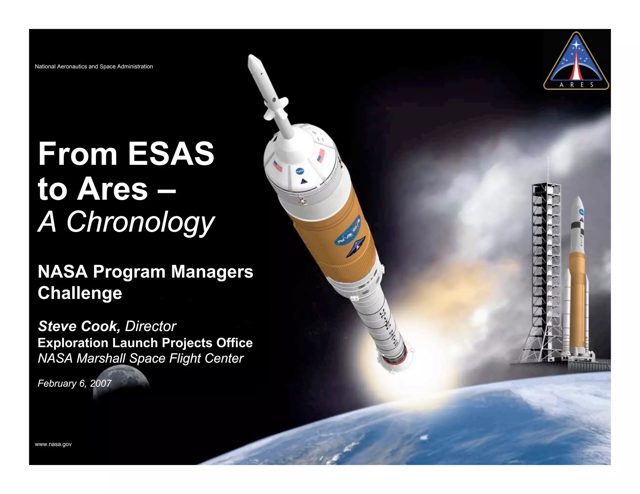 The document discusses NASA's Ares program which was developing the Ares I and Ares V launch vehicles. It summarizes that the 2005 Exploration Systems Architecture Study recommended a shuttle-derived rocket design based on extensive analysis showing it was the most cost effective approach. The Department of Defense and Congress agreed with this assessment. The Ares vehicles were intended to safely enable sustainable exploration of the Moon and Mars. Charts are presented comparing the performance and costs of the Ares vehicles to alternative options considered.