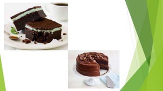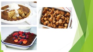 This document provides a classification and overview of different types of desserts and their key characteristics. It identifies 10 main categories of desserts: 1) fruits, 2) cheese, 3) gelatin, 4) custard, 5) pudding, 6) fruit cobblers, 7) pastries, 8) baked desserts, 9) fried desserts, and 10) frozen desserts. For each category, it provides a description and lists characteristics like texture, consistency, ingredients and preparation methods. It includes examples for each category and assessments to test understanding of dessert classifications and properties.
