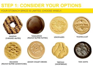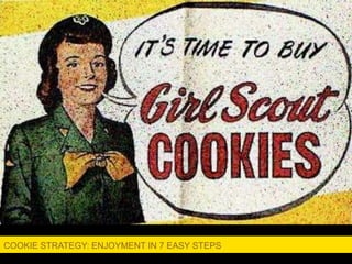 This 7-step guide recommends strategies for maximizing cookie enjoyment, such as considering your stomach capacity, ordering in multiples of three boxes to avoid regret, dancing while cookies are prepared, waiting impatiently for their arrival, and ultimately experiencing a "cookiegasm" upon receiving your much-anticipated order. The document encourages responsible cookie indulgence for ultimate satisfaction.