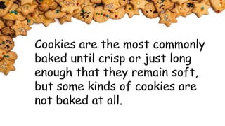 Cookies can be soft or crisp depending on how long they are baked. There are different types of cookies including drop cookies made from soft dough dropped by spoonfuls, refrigerated cookies made from very stiff dough, hand-shaped cookies made from stiff dough molded into balls, cut-out cookies made from rolled dough cut into shapes, and no-bake cookies made by pressing ingredients into a pan without baking.