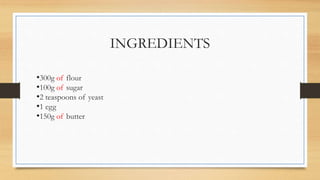 The document provides a recipe for making cookies with ingredients including flour, sugar, yeast, an egg, and butter. The instructions specify putting the dry and wet ingredients separately into a bowl and mixing them together by hand until a dough forms. The dough is then rolled out and cut into shapes before being baked in the oven at 180 degrees for 10 minutes, at which point the cookies are ready to eat.