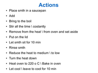 The document provides instructions for cooking porridge and lists various grains that can be used like oats, buckwheat and semolina. It also lists vegetables commonly used in cooking like lettuce, cabbage, carrots and onions. Additional food items mentioned include beef, pork, steak, sour cream, chips, pasta and baked goods like scones, biscuits and waffles.