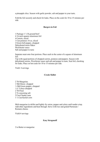 3. Several other foil packet recipes - Chicken in Foil with vegetables and pineapple; Burgers in Foil with toppings; and Ranch Style Eggs with vegetables.
