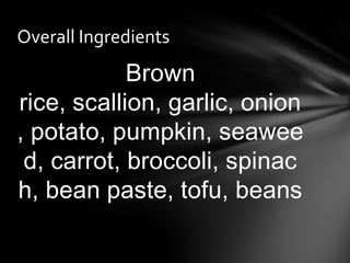 The document provides instructions for making a healthy Korean-style dinner of bean paste soup and beef and cooked vegetable salad. The bean paste soup is made with tofu, bean paste, onions, mushrooms, clams, cucumbers and scallions. The beef and vegetable salad contains broccoli, carrots, beef and scallions. Detailed step-by-step instructions are given for cutting vegetables and meat, boiling vegetables for the soup, adding ingredients to the soup and frying pan, and mixing the salad with soy sauce before enjoying the completed meals.