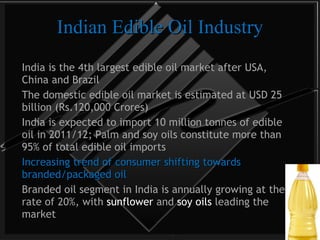 The edible oil market in India is the 4th largest globally worth $25 billion annually. India imports most of its edible oil needs, with palm and soy oils making up over 95% of imports. Branded cooking oils are growing at 20% annually, led by sunflower and soy oils. Major players in the Indian edible oil industry include national dairy development board, ITC, Marico industries, and Adani Wilmar. Per capita consumption varies greatly from 20kg for the top 10% to just 5kg for the bottom 30%.