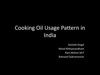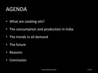 This document summarizes cooking oil usage patterns in India. It notes that annual consumption of cooking oils in India is 17.55 million tons and is dominated by palm oil, which accounts for 46% of consumption despite low domestic production of 1.07%. Demand for cooking oils is expected to continue rising along with population and income growth. Imports, which currently meet around 60% of demand, are projected to rise and meet an even larger share of total demand in the future. The key driver of changing consumption trends toward cheaper imported palm oil has been its lower cost compared to traditional domestically produced oils.