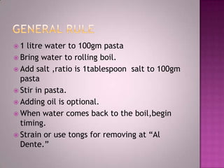 To cook pasta properly, bring 1 liter of water to a boil for every 100 grams of pasta. Add 1 tablespoon of salt per 100 grams of pasta. Stir the pasta into the boiling water and cook until al dente, or tender but still slightly firm to the bite. Do not rinse pasta after cooking unless using it for a cold salad. Toss cooked pasta with a small amount of oil or butter before topping with sauce or stirring directly into the sauce to coat evenly.