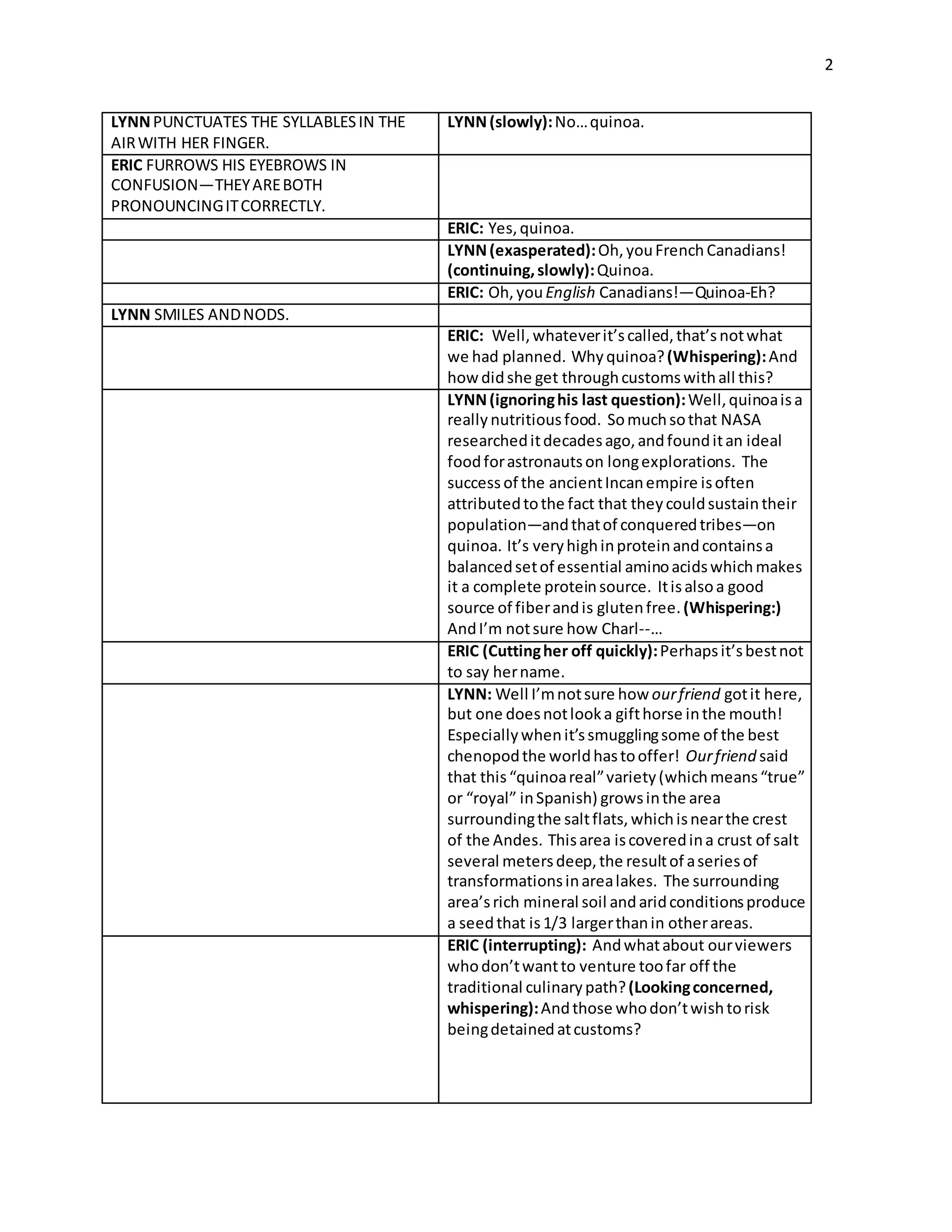 The document is a script for a cooking show that introduces recipes using CulinaryTwist sauces. It will showcase Maya Bay scallops, Baja quinoa salad, and Bora Bora ribs. However, during preparation, Lynn discovers a large gold artifact hidden in a bag of quinoa smuggled from Bolivia, leading Eric to become nervous about their collection of rare historical relics. They continue with replacing the dishes with the quinoa salad and ribs, educating viewers about quinoa along the way.