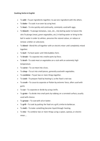 This document provides definitions for various cooking verbs in English, including verbs like to add, bake, beat, blend, boil, broil, carve, chop, combine, cook, crush, cut, grate, grease, grill, melt, mix, and more. It explains how each verb is used in the context of food preparation and cooking.
