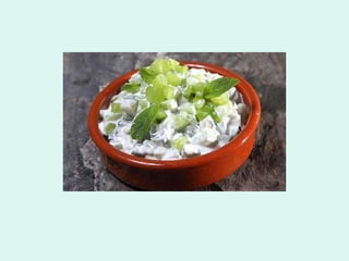 This document provides instructions for making Cacik, a Turkish cucumber and yogurt salad. It lists the ingredients as two cucumbers, yogurt, garlic, salt and mint. The instructions are to peel and cut the cucumbers, add them to a bowl with yogurt and garlic, season with salt, and garnish with mint before serving and enjoying the finished dish.