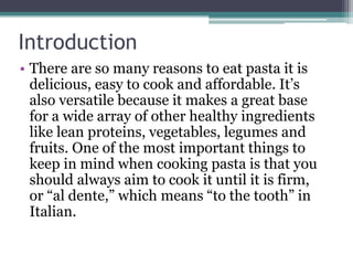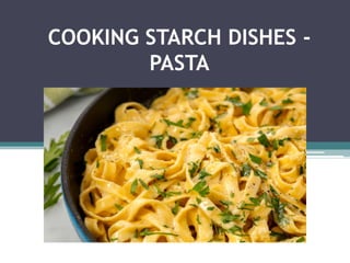 This document provides information on cooking pasta and starch dishes. It discusses that pasta should be cooked al dente until it is firm but tender. Cooking time depends on the shape and size of the pasta. Sauces should also match the texture of the pasta shape. The document also discusses common problems that can occur when cooking with starches like thinning, weak gel, or scorching. It provides cooking times for different pasta shapes to achieve al dente texture.