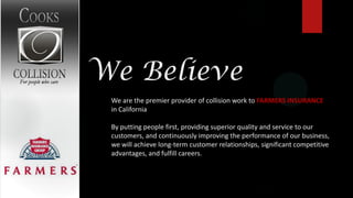 Cooks Collision is a premier provider of collision repair services in California with 27 locations. They have been family owned since the 1930s and take pride in their high quality work, certified technicians, and commitment to customer service. They repair over 30,000 vehicles per year for customers, insurance companies like Farmers, and auto dealers. Their modern facilities utilize advanced equipment to properly repair any make and model to factory standards.