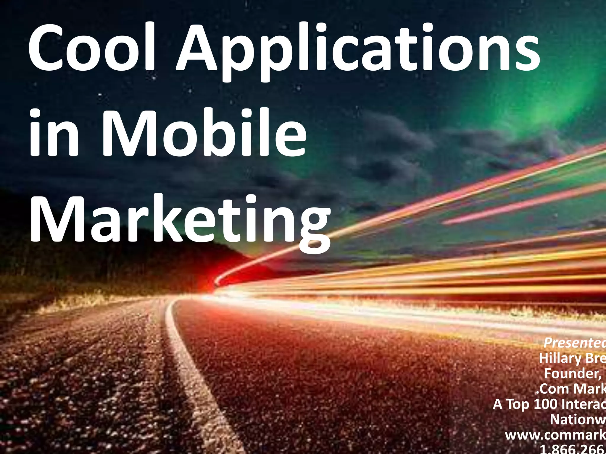 Hillary Bressler presented on cool mobile marketing applications including 2D barcode scanning, augmented reality, and mobile apps. 2D barcodes can be used for mobile check-in, boarding passes, and engaging extra content. Augmented reality overlays digital information on a device's camera view of the real world. Examples include providing information about nearby attractions. Mobile apps are widely used, with 50% of iPhone owners buying a paid app monthly. Examples given were destination apps and augmented reality navigation. Bressler advocated that brands should engage customers through these mobile technologies.