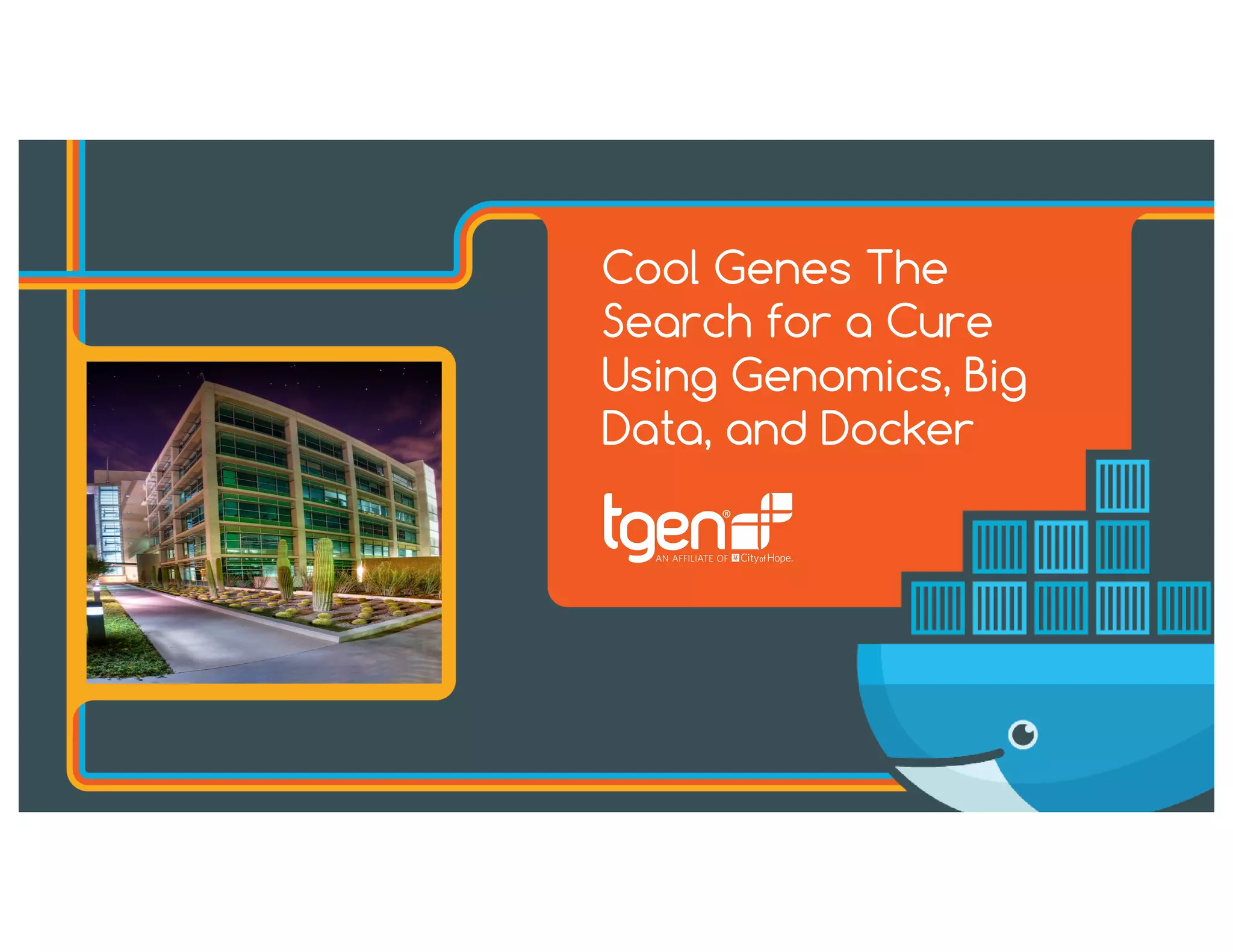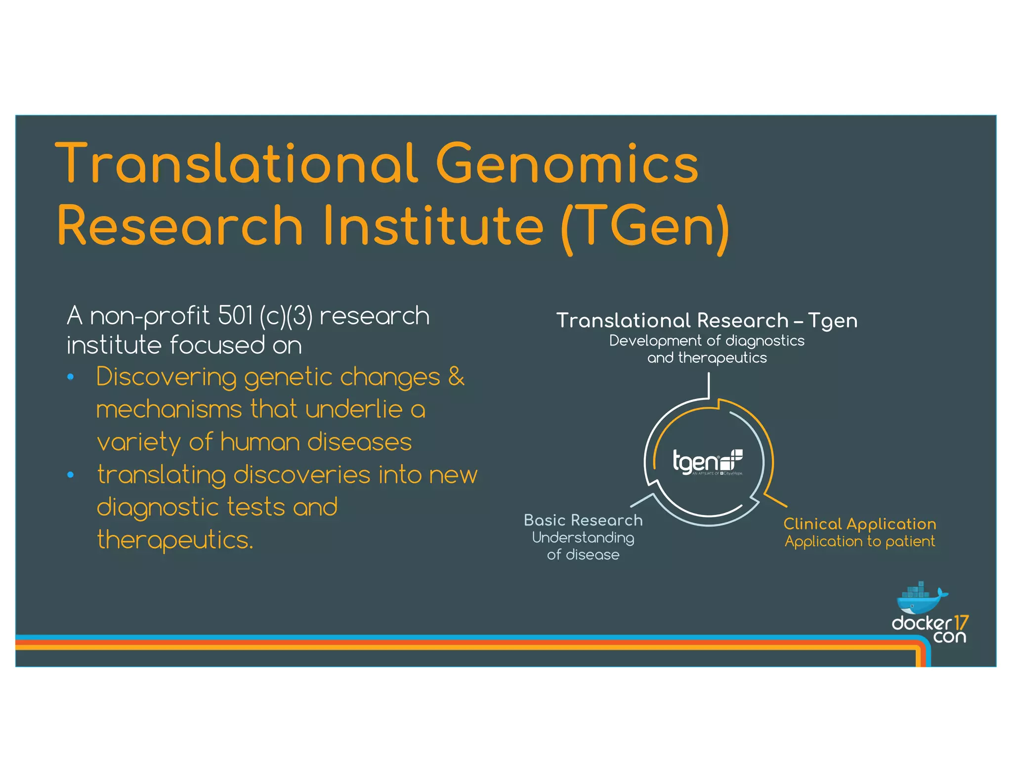 The document outlines the mission and operations of a non-profit research institute focused on translational genomics, aiming to discover genetic mechanisms behind diseases and develop diagnostics and therapeutics. It highlights advancements in genomic technologies, including a shift from lengthy data analyses to more efficient processes enabled by optimized hardware and workflows, particularly utilizing Docker and cloud services. The future vision includes leveraging the cloud for sustainable long-term data storage and integrating various data types for improved healthcare outcomes.