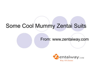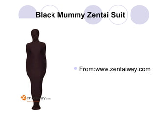 The document features descriptions of seven different mummy zentai suits available for purchase from www.zentaiway.com, including black, golden, shiny black, newspaper print, white, and orange styles. Each suit is made of tight-fitting fabric designed to make the wearer look like an Egyptian mummy.