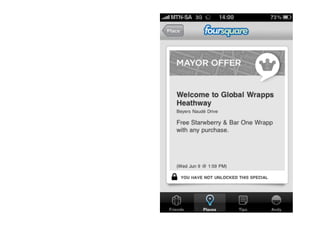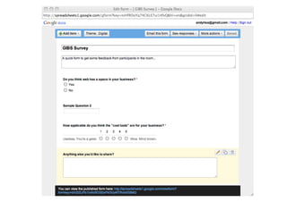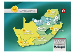 The document discusses the state of internet access in South Africa as of 2010, highlighting that only 5.3 million of the 50 million population have PC internet access, with a significant presence on social media platforms like Facebook. It offers insights on utilizing online tools for customer engagement, reputation management, and advertising on platforms such as Facebook and Google AdWords, while noting the importance of listening to customers. Additionally, it emphasizes productivity through cloud-based tools and services like Google Docs and Google Wave, underscoring both advantages and security considerations.