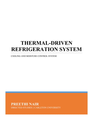 The document discusses thermal-driven refrigeration systems as an alternative to conventional air conditioning that uses less electricity and pollutes less. It summarizes two common absorption refrigeration pairs: ammonia-water and water-lithium bromide. It then introduces a new sorbent-sorptive pair using sodium thiocyanate as the absorbent and ammonia as the refrigerant. The document includes schematics of typical absorption cycles and the components involved, such as the evaporator, absorber, generator, condenser and expansion valves. It provides a detailed description of the refrigeration cycle using the new sodium thiocyanate-ammonia pair.