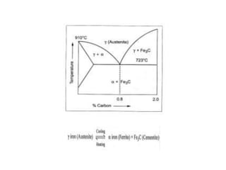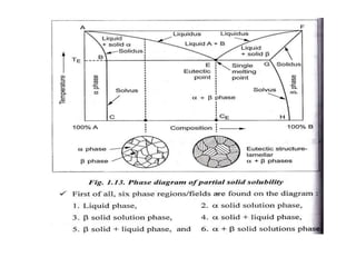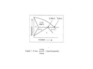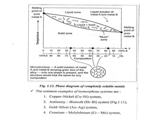 The document discusses cooling curves and phase diagrams. It describes cooling curves for pure metals and binary systems, showing temperature remaining constant as latent heat is released during solidification. It also outlines different types of phase diagrams for binary alloy systems with complete or partial solid solubility. Key phase reactions discussed include eutectic, peritectic, eutectoid, and peritectoid reactions.