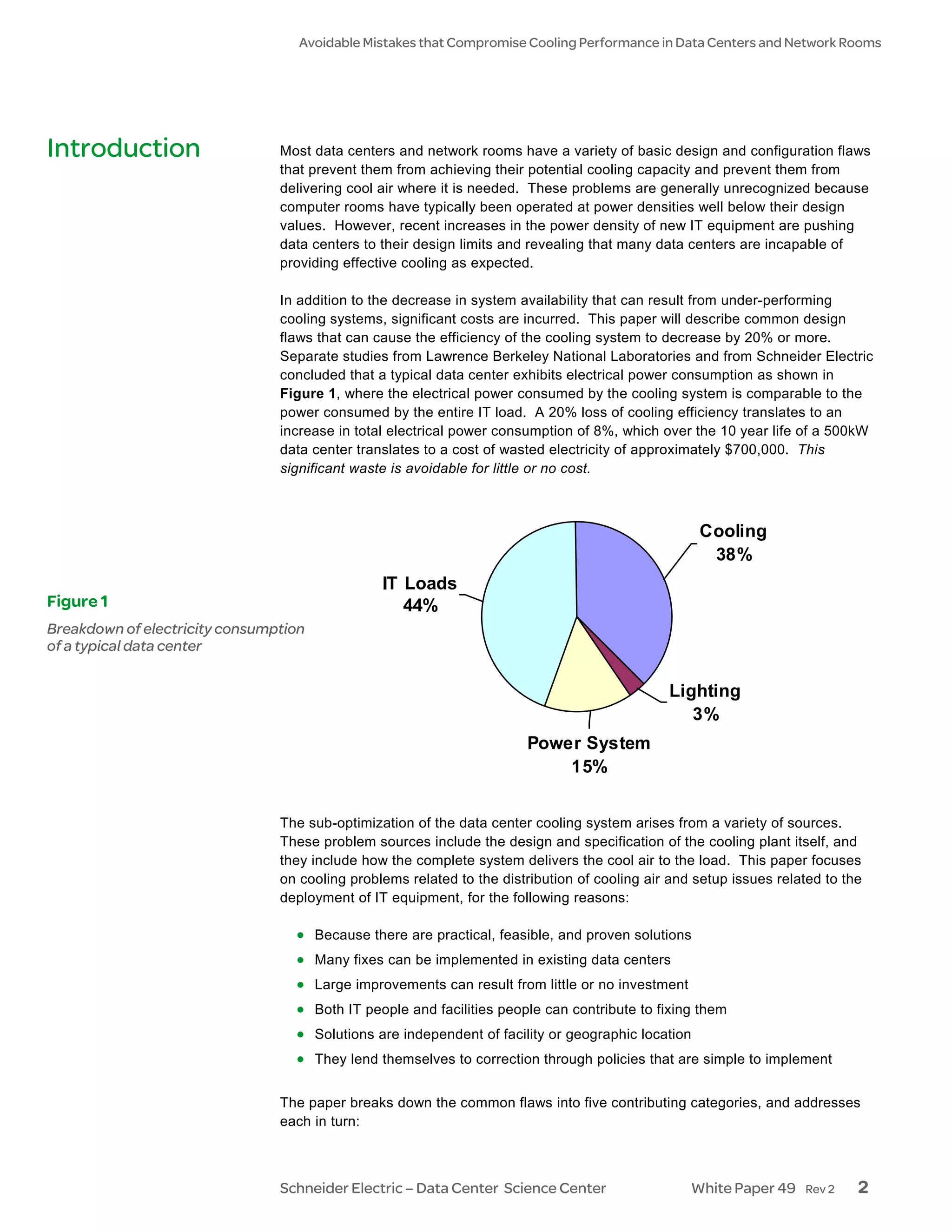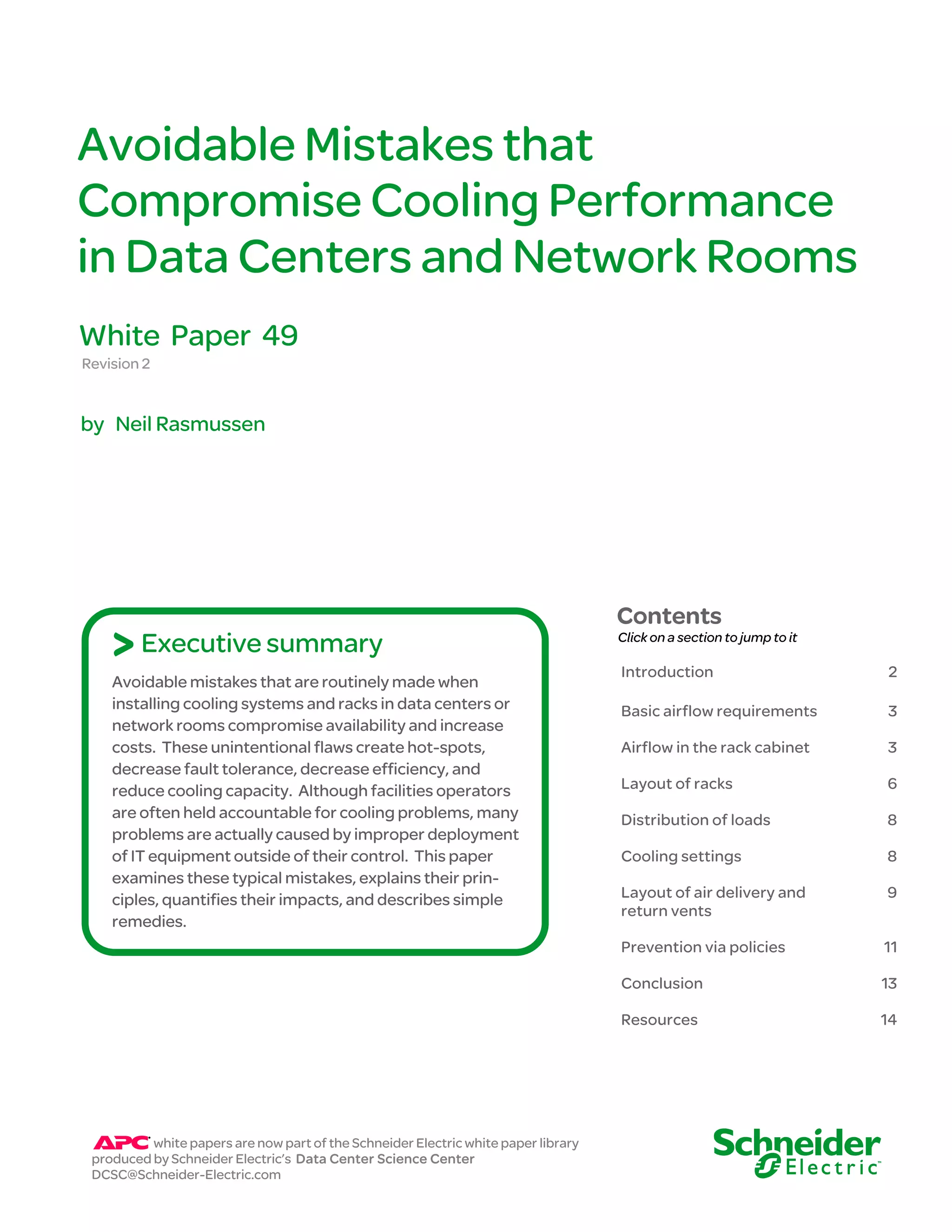 This document discusses common mistakes that compromise cooling performance in data centers and network rooms. It examines five categories of typical mistakes: airflow in the rack, rack layout, load distribution, cooling settings, and air delivery/return vent layout. Mistakes such as omitting blanking panels, improper rack layout, and obstructed airflow can cause hot spots, decrease fault tolerance, reduce efficiency and capacity, increasing costs by up to 25% over the lifetime of the data center. The document provides solutions to address each problem through standardized racks, blanking panels, proper hot/cold aisle layout, unobstructed airflow, and policies to prevent these issues.