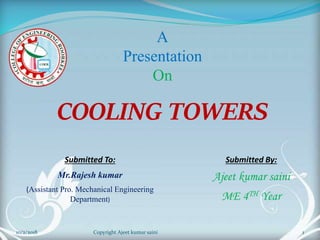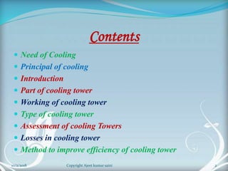 The document is a presentation on cooling towers. It discusses the components, types, and assessment of cooling towers. There are two main types - natural draft towers that use convection and mechanical draft towers that use fans. Mechanical draft towers can be forced draft, induced draft cross flow, or induced draft counter flow. The performance of cooling towers is assessed using parameters like range, approach, and effectiveness. Higher range and lower approach indicate better performance.