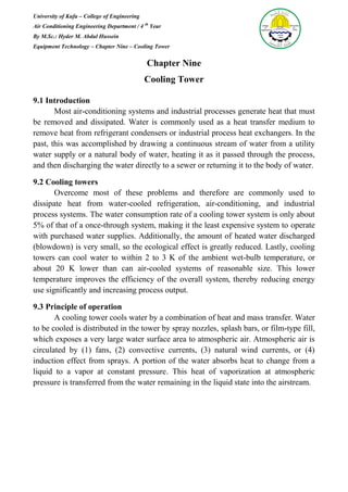 1) Cooling towers are commonly used to dissipate heat from water-cooled refrigeration and air conditioning systems. They work by exposing water to atmospheric air, allowing some of the water to evaporate and transfer heat from the remaining liquid water into the air stream.