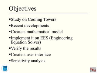 The document details a study on cooling towers, focusing on the creation of a mathematical model implemented in the Engineering Equation Solver (EES) for thermodynamic analysis. It includes various types of cooling towers, governing equations, and results from experimental and modeled comparisons. Key findings emphasize the accuracy of simulations, with suggestions for further investigation into errors and additional theories.