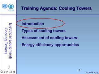 The document discusses energy efficiency opportunities in cooling towers. It begins with an introduction to cooling towers, including their components and types. It then covers assessing cooling tower performance by measuring parameters like temperature ranges, approach, effectiveness, cooling capacity, and cycles of concentration. Finally, it outlines some energy efficiency opportunities in cooling towers, such as selecting an appropriately sized tower, using efficient fills and fans/motors, and optimizing pumps and water distribution. The overall goal is to help trainees understand and improve the energy efficiency of industrial cooling towers.