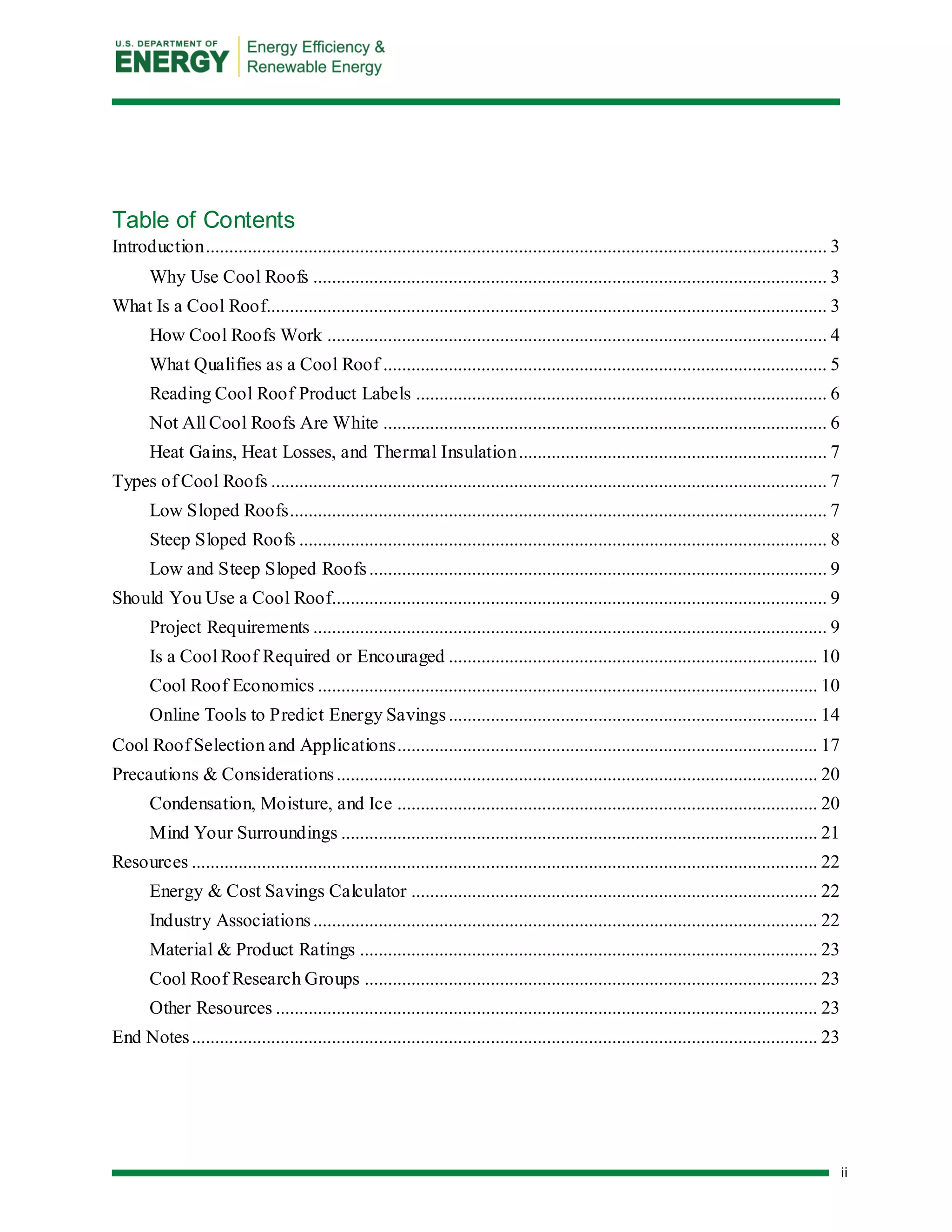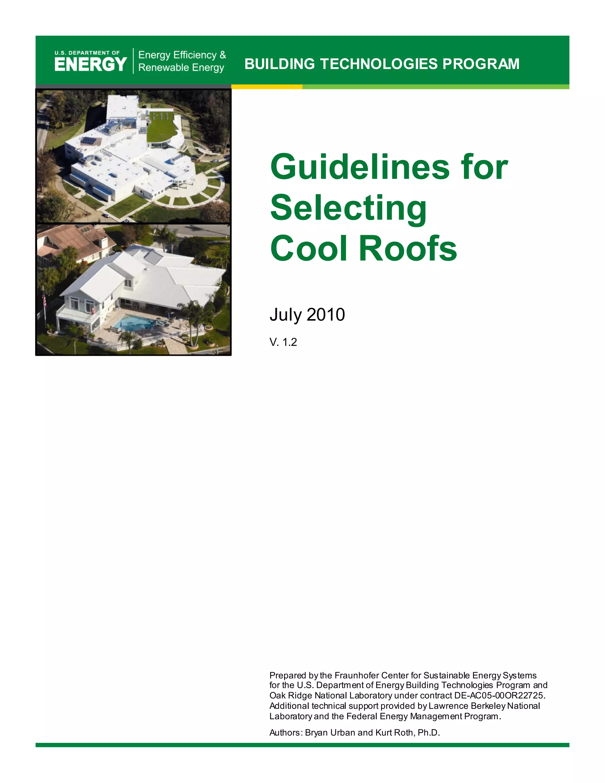 This document provides guidelines for selecting cool roofs. It explains that cool roofs have high solar reflectance and thermal emittance, which keep the roof surface cooler than traditional dark roofs. This is done by reflecting more sunlight and efficiently emitting heat. Cool roofs can reduce energy costs by decreasing air conditioning needs and may extend roof lifespan. The document provides an overview of different cool roof options for low-sloped and steep-sloped roofs, and considerations for determining if a cool roof makes sense for a particular building project.