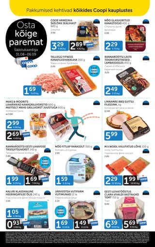Документ содержит предложения по сниженным ценам на продукты в магазинах Coop на период с 31 августа по 6 сентября 2021 года. Включены разнообразные продукты, такие как мясные изделия, молочные продукты, кондитерские изделия и напитки. Условия скидок применяются при использовании карточки säästukaart или банковской карты Coop.