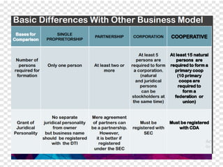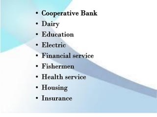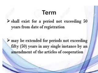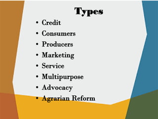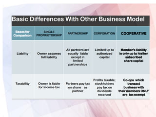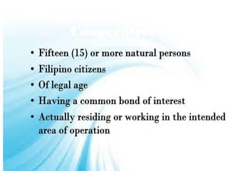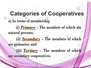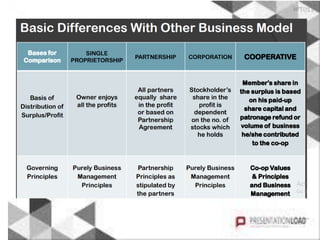 This document summarizes the origins and key concepts of cooperatives. It discusses important theorists and organizations in the development of the cooperative movement such as Robert Owen, the Rochdale Pioneers, and Friedrich Raiffeisen. It also outlines the key values of cooperatives including self-help, self-responsibility, democracy, equality, equity and solidarity that form the basis of the cooperative principles. Finally, it discusses concepts relevant to cooperatives including hybrid models, isomorphization, and false cooperatives.