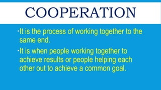 Cooperation involves working together towards a common goal. It creates an atmosphere where people feel safe, trusted, and supported as they encourage and help one another. The document provides examples of cooperative and uncooperative behaviors - attending community meetings, participating in group projects, helping clean the classroom, and contributing to fundraising show cooperation, while littering, making others clean up after you, and not participating in school programs lack cooperation.